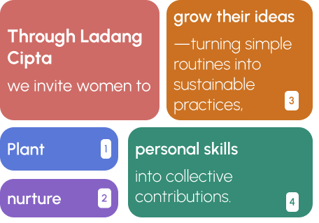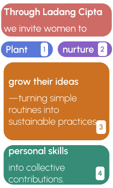 Ladang Cipta is a dynamic empowerment program that helps women turn everyday creativity into meaningful impact— Because women are already solving problems every day— in the kitchen, in the community, in their heads.